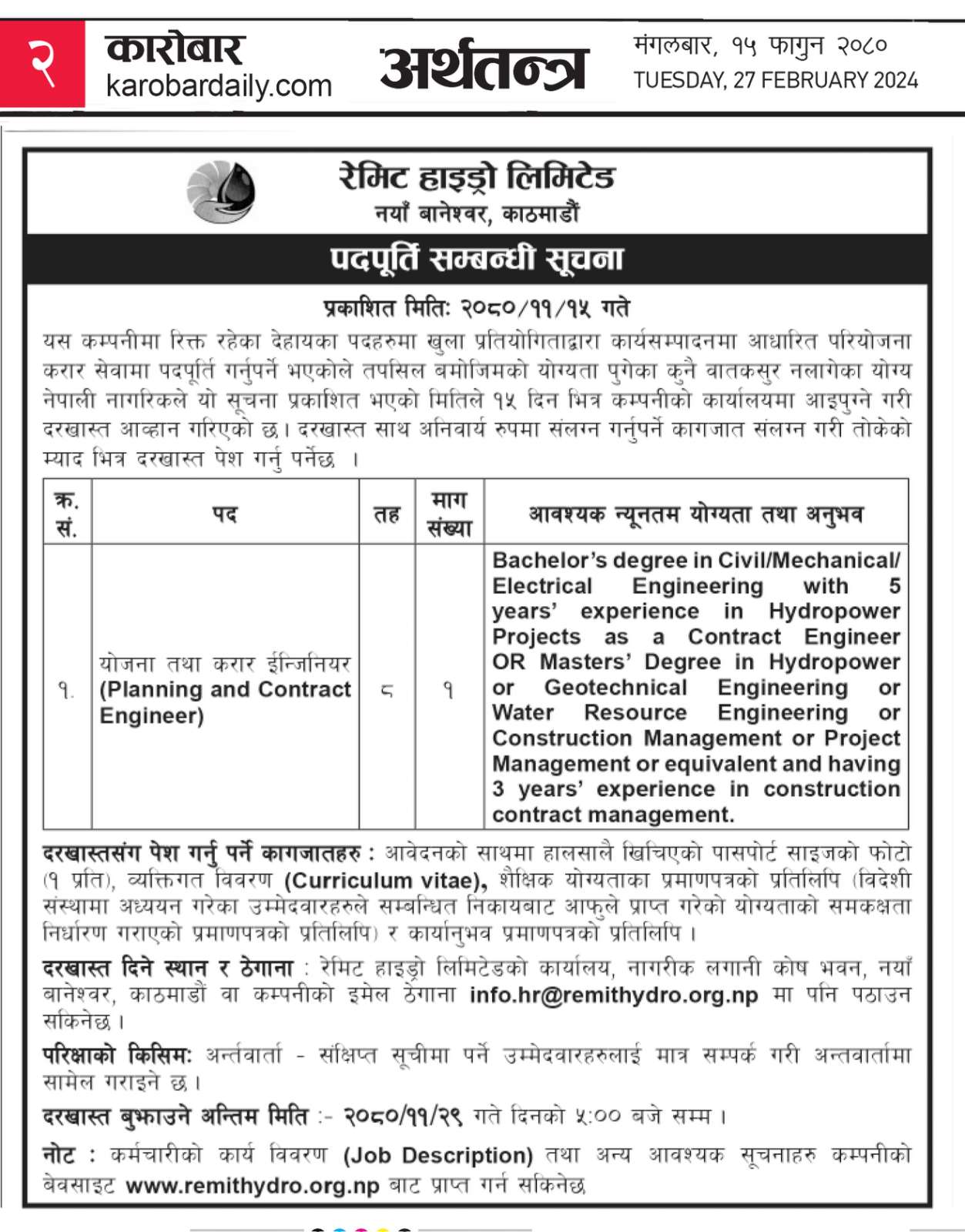 पदपूर्ति सम्बन्धी सूचना [योजना तथा करार इन्जिनियर (Planning and Contract Engineer)]