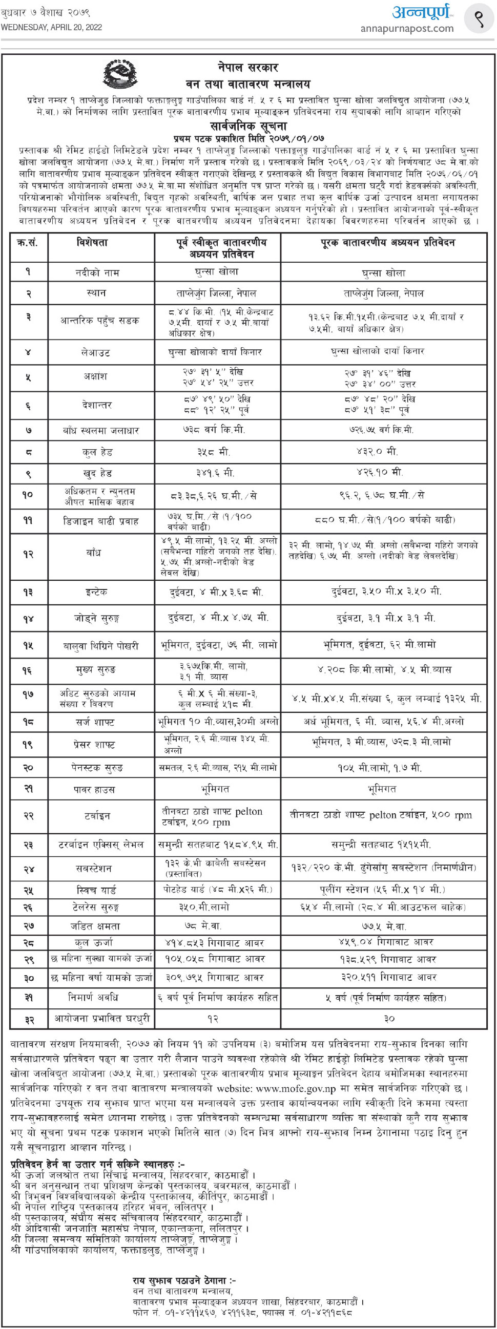 घुन्सा खोला जलविद्युत आयोजना (७७.५ मे.वा.) को निर्माणका लागि प्रस्तावित पूरक वातावरणीय प्रभाव मूल्याङ्कन प्रतिवेदनमा राय सुझावको लागि आव्हान गरिएको सार्वजनिक सूचना