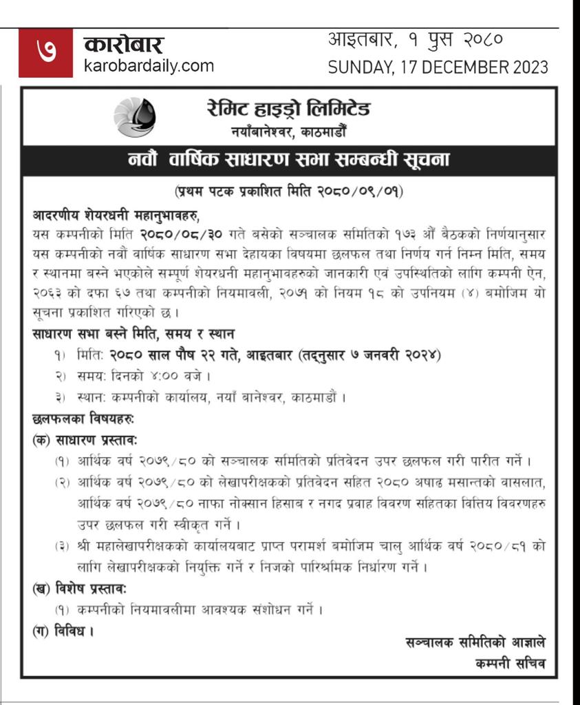 नवौँ वार्षिक साधारण सभा सम्बन्धी सूचना