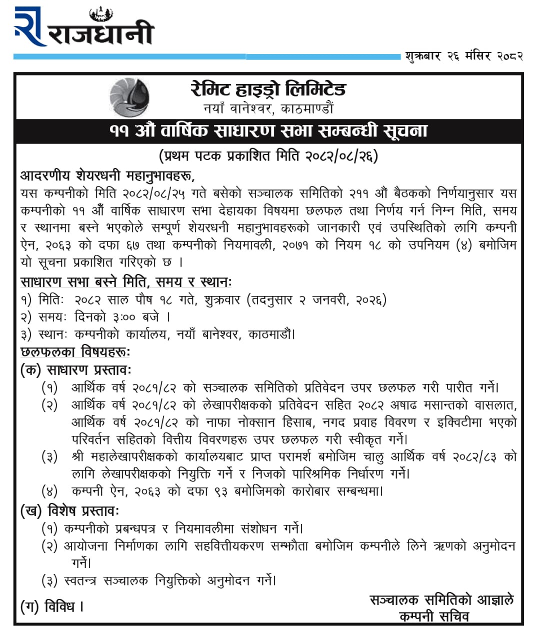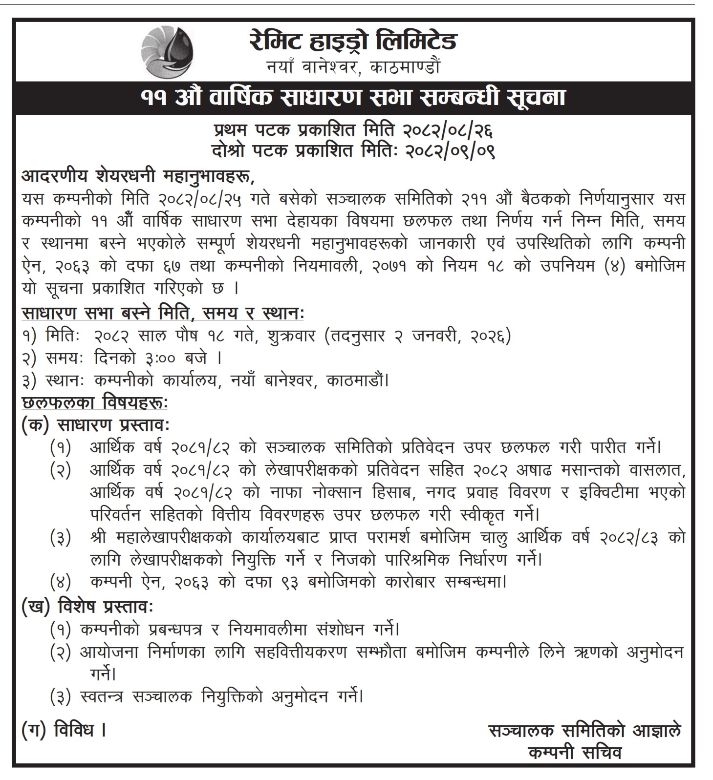 एघारौँ वार्षिक साधारण सभा सम्बन्धि सूचना