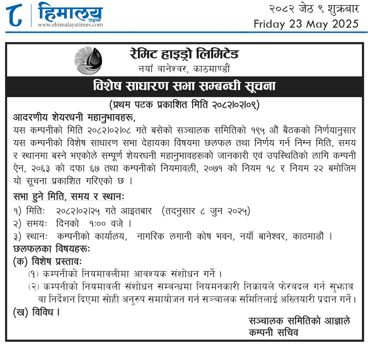 विशेष साधारण सभा सम्बन्धी सूचना
