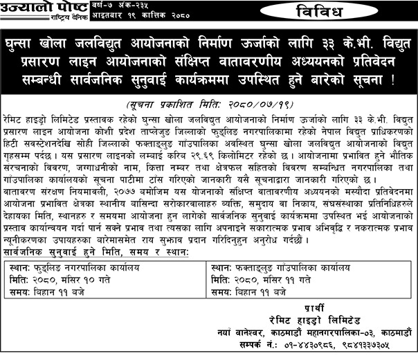 घुन्सा खोला जलविद्युत आयोजनाको निर्माण ऊर्जाको लागि ३३ के.भी. विद्युत प्रसारण लाइन आयोजनाको संक्षिप्त वातावरणीय अध्ययनको प्रतिवेदन सम्बन्धी सार्वजनिक सुनुवाई कार्यक्रममा उपस्थित हुने बारेको सूचना