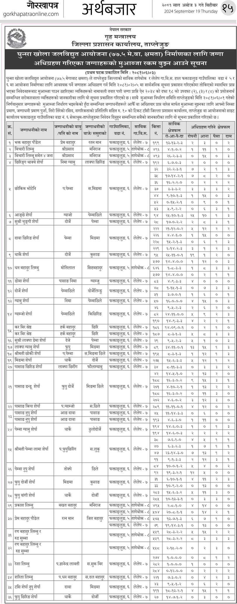 घुन्सा खोला जलविद्युत आयोजना (७७.५ मे.वा. क्षमता) निर्माणका लागि जग्गा अधिग्रहण गरिएका जग्गाहरुको मुआब्जा रकम बुझ्न आउने सूचना