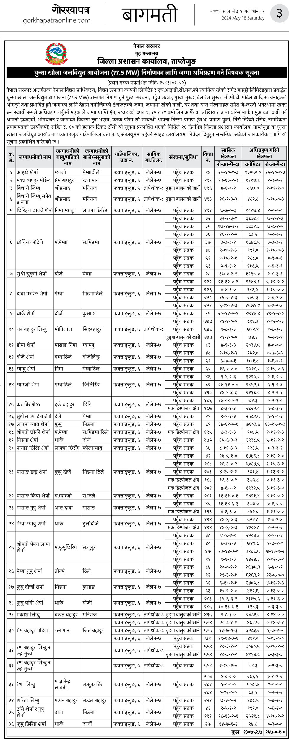 घुन्सा खोला जलविद्युत आयोजना (77.5 MW) निर्माणका लागि जग्गा अधिग्रहण गर्ने विषयक सूचना
