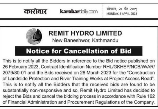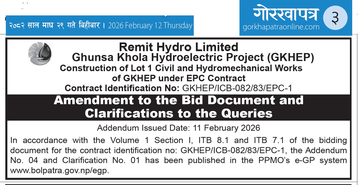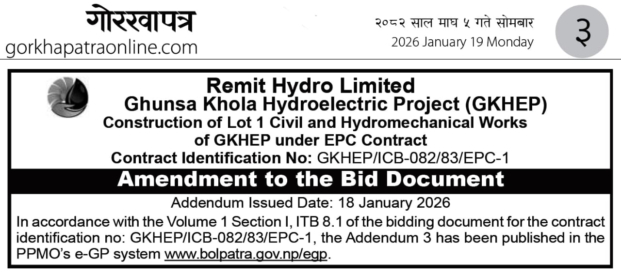 Notice for Amendment to Bid Documents of Lot 1 Civil and Hydromechanical Works of Ghunsa Khola HEP