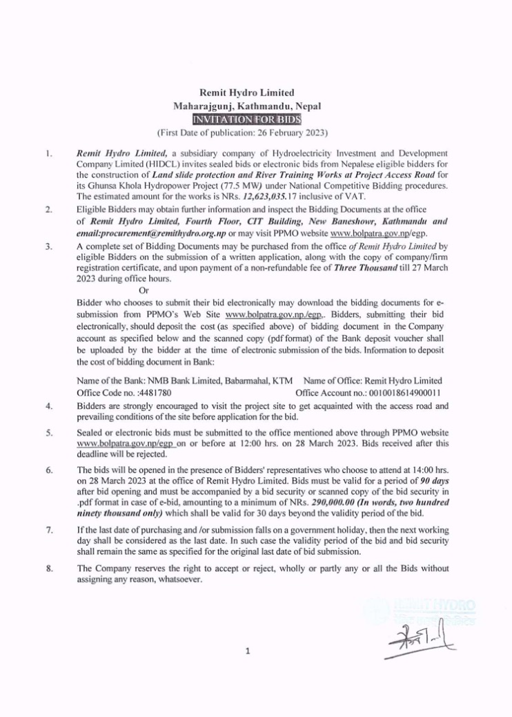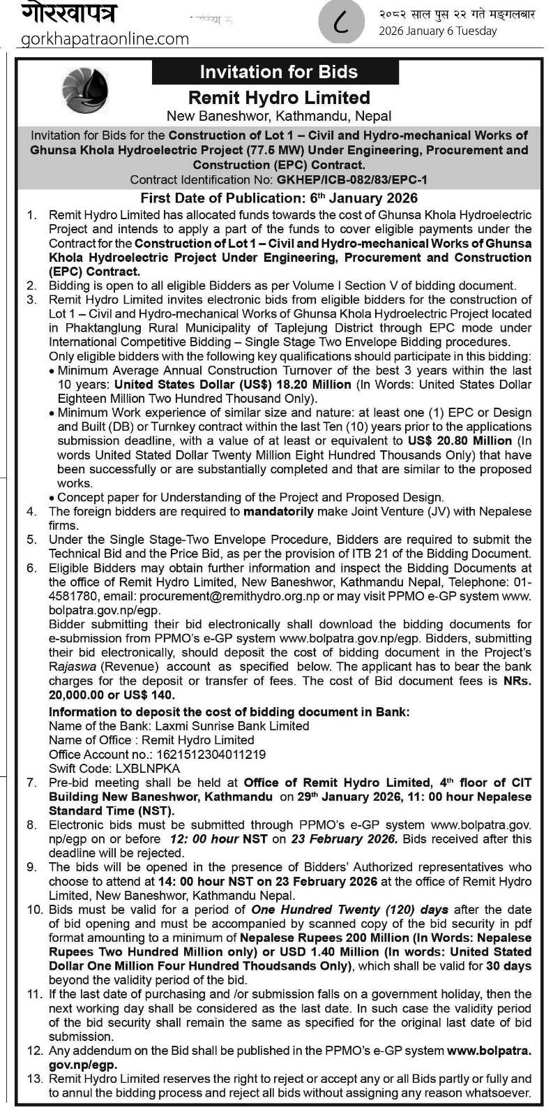 Invitations for bid of the Construction of Lot 1 - Civil and Hydro-mechanical Works of Ghunsa Khola Hydroelectric Project (77.5 MW) Under Engineering, Procurement and Construction (EPC) Contract.