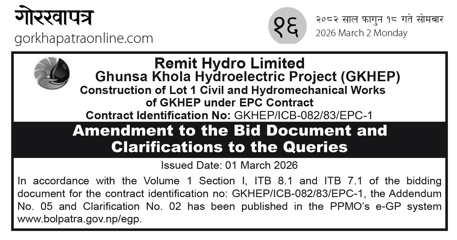 Notice for Amendment to the Bid Document and Clarifications to the Queries of Lot 1 Civil and Hydromechanical Works of Ghunsa Khola HEP