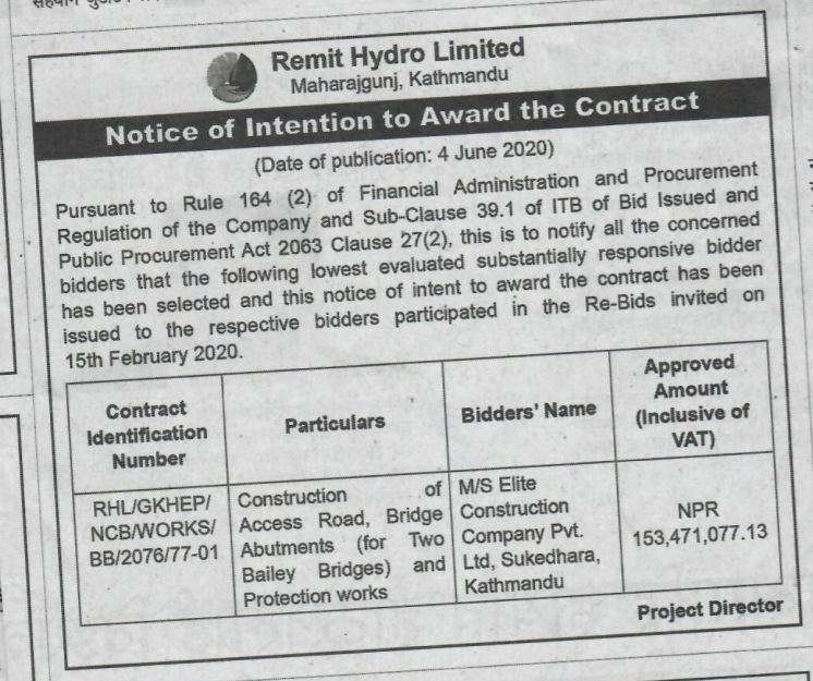 Notice of Intention to Award the Contract [RHL/GKHEP/NCB/W CF/2079/80-02]