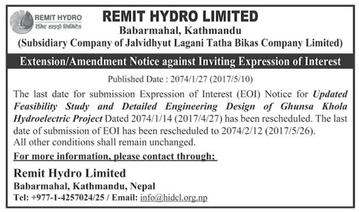 Extension/Amendment Notice against Inviting Expression of Interest for Updated Feasibility Study and Detailed Engineering Design of Ghunsa Khola Hydroelectric Project